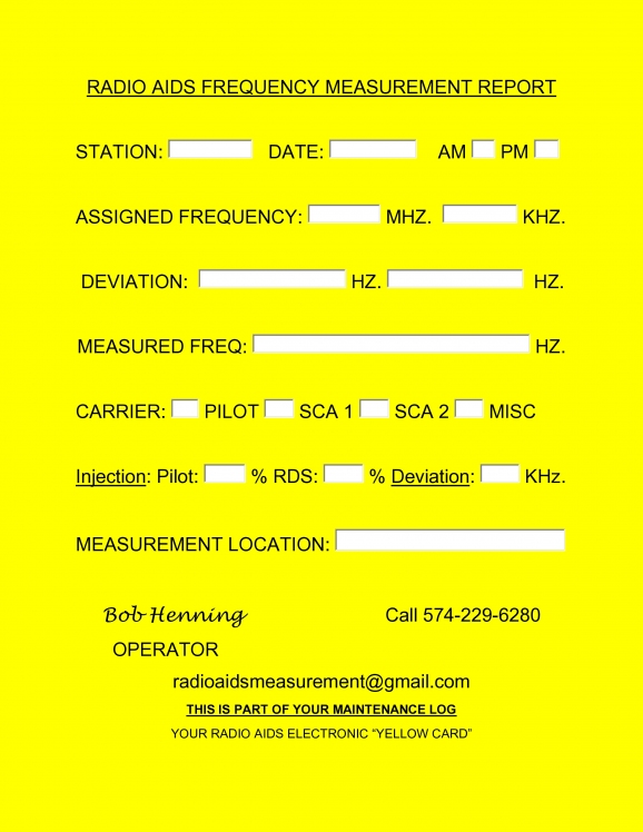 Our company is constantly evolving and growing. We can send you a yellow card either through US Mail, or electronically. We provide wide range of services for reading carrier frequencies for broadcast Radio and Television stations. We also do NRSC-2 measurements for AM broadcast stations. Our mission is to provide best, most accurate service possible. Radio Aids is almost 70 years old and some of our clients have been customers for the entire time we have been in business.